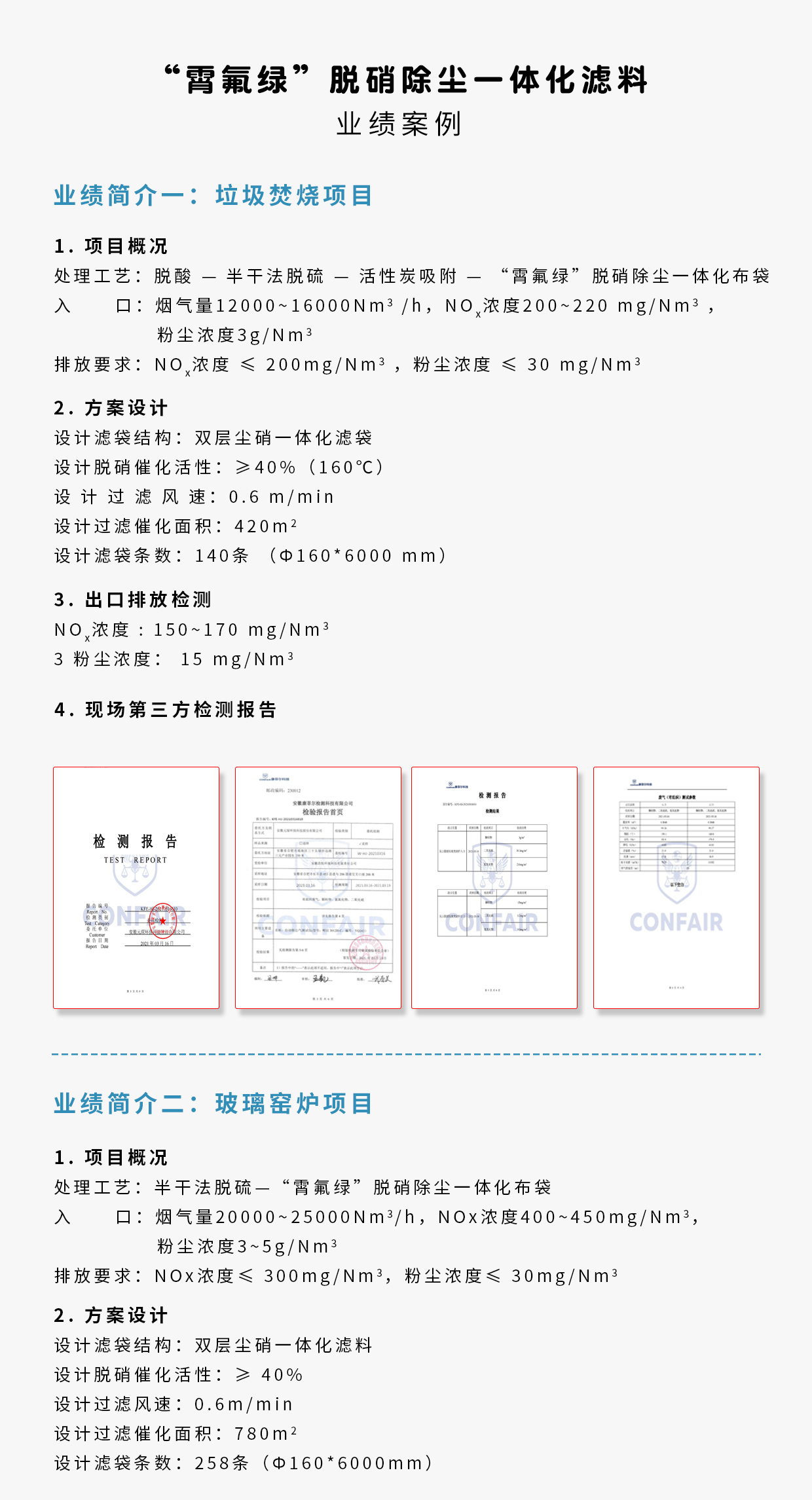 | 應用場合 | 硫含量低、水含量低、過濾精度 較低的場合代替布袋與部分SCR脫硝催化劑 |